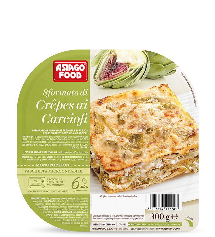 Indulge in the creamy béchamel and flavorful artichoke sauce, all wrapped in three layers of delicate crêpes. A light sprinkle of grated cheese completes this rich and appetizing vegetarian dish, which is both easy and quick to prepare. You can enjoy this product directly in its tray after cooking it in the microwave for about 6 minutes on medium power, or in a conventional oven for 15-20 minutes at 200 °C. The product contains 1 serving.