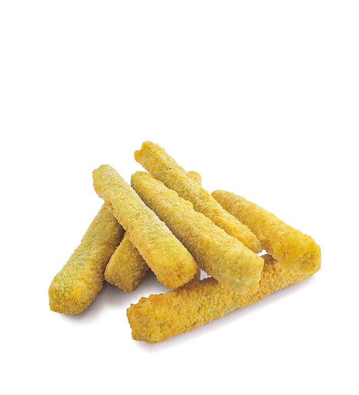 Our IQF Veggie fries are appetizing sticks made with chickpeas, potatoes and vegetables covered in a mouthwatering batter. They are suitable for a vegan diet and any occasion is perfect for serving them: serve them alongside your preferred sauces for a distinctive and inventive appetizer. They can be prepared by pan-frying them for 1 minute in hot oil, or in the oven without added fat for about 15 minutes.