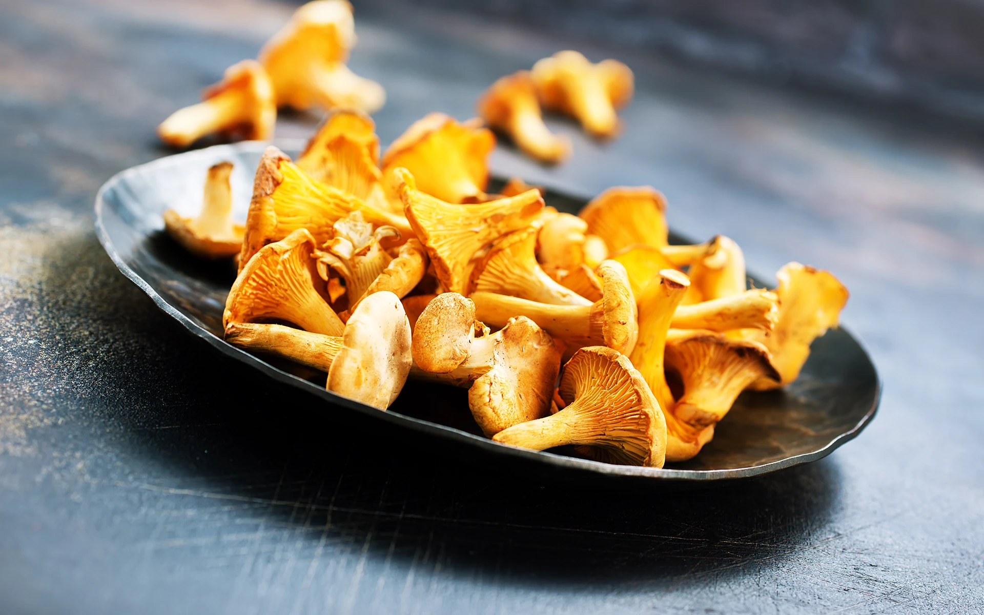 Chanterelle mushrooms (Cantharellus cibarius). May contain traces of gluten, soybeans, celery, mustard.