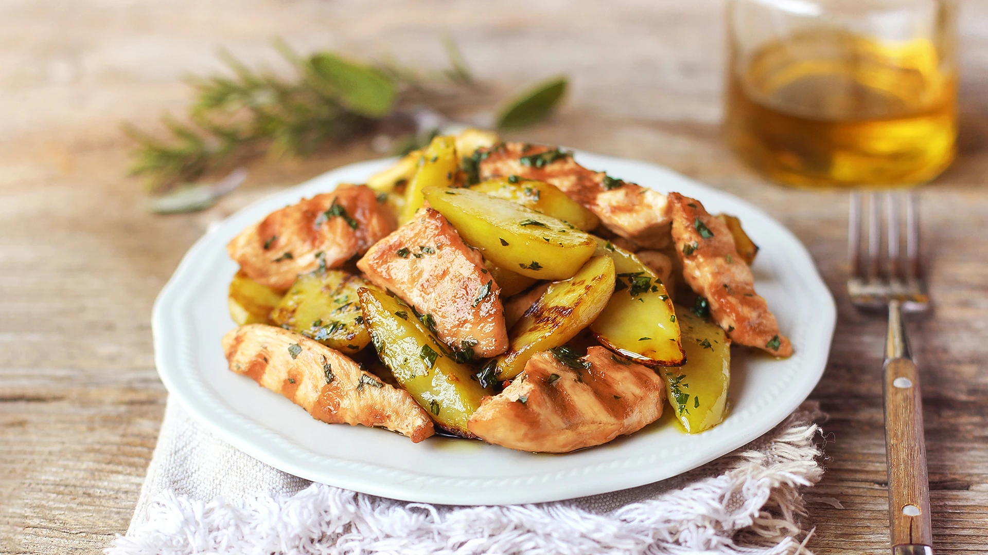 Tender grilled bites of chicken breast accompanied by the most classic of side dishes: grilled potato wedges, extra virgin olive oil and herbs.