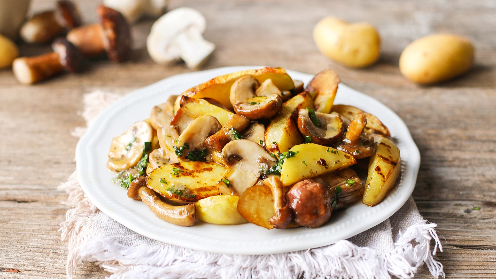 A delicious side dish with autumnal scents featuring mixed mushrooms, including Porcini, grilled potato wedges and Italian extra virgin olive oil.