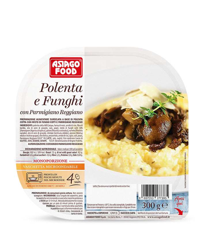 A delicious and comforting recipe, as good as homemade, made with 5 varieties of mushrooms accompanied by a delicate dressing and enriched with Parmigiano Reggiano cheese. Our frozen polenta is perfect as a main course or a quick lunch meal: it’s ready in just 4 minutes thanks to the convenient single-portion tray that can be placed directly in the microwave.