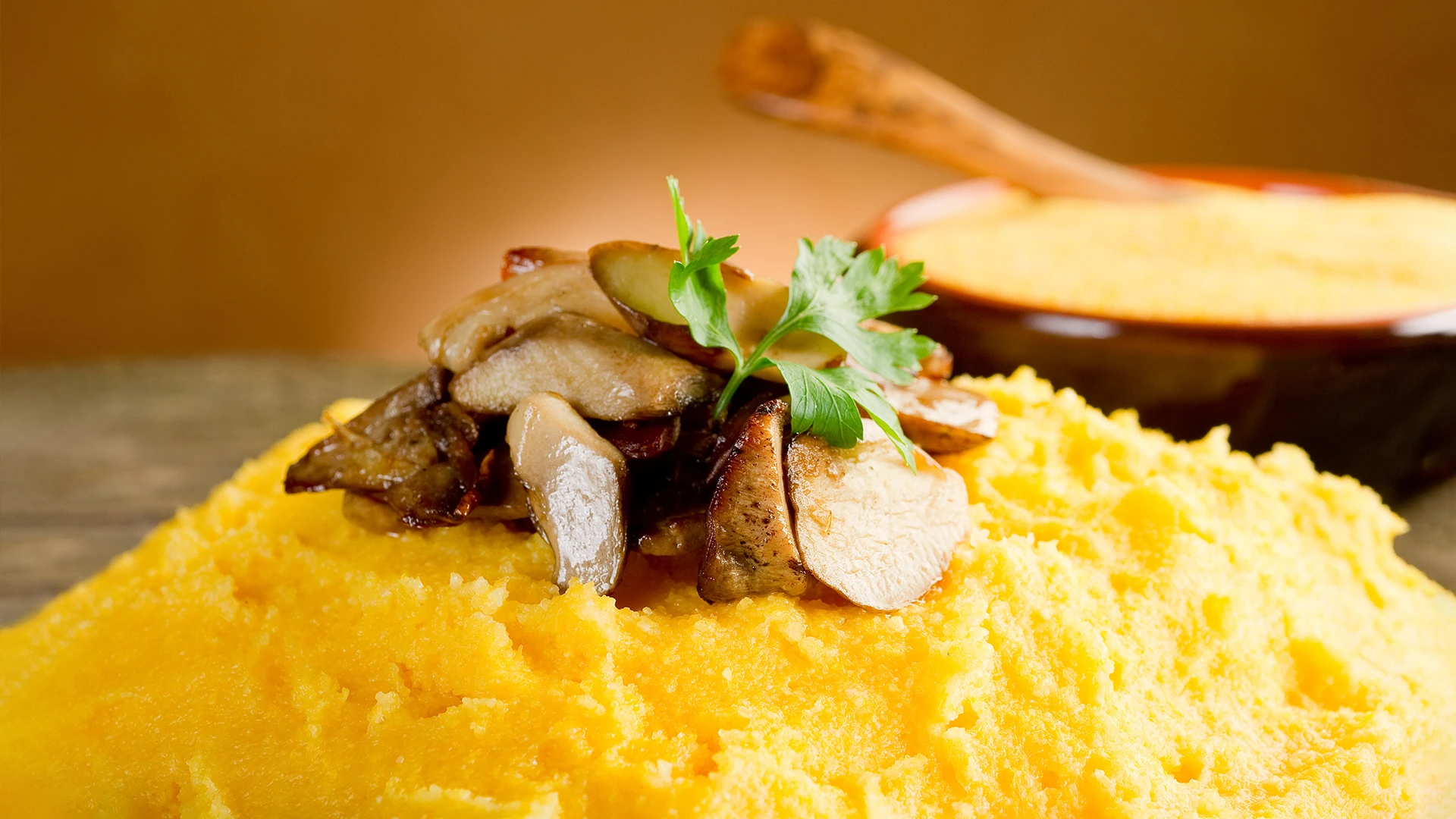Creamy corn polenta with sautéed mixed mushrooms, including delicious Porcini, and PDO Parmigiano Reggiano. A tasty vegetarian dish in a microwavable tray.