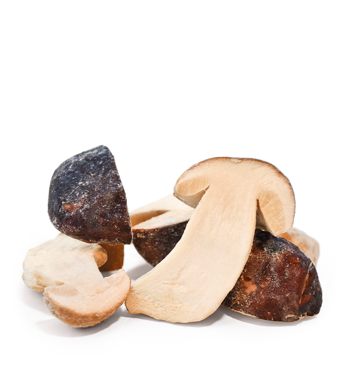 Cleaned mushrooms, cut in half, frozen within a few hours of harvest using the IQF technique. Delicious and with excellent yield in the dish, they are a precious ingredient that will be able to give your preparations the distinctive aroma of the forest: ideal accompaniment to meat and fish dishes, typical polenta-based recipes or as a condiment for risottos and tagliatelle. Also practical for garnishing pizzas, focaccias, lasagnas, savory pies, and for preparing creams and sauces.